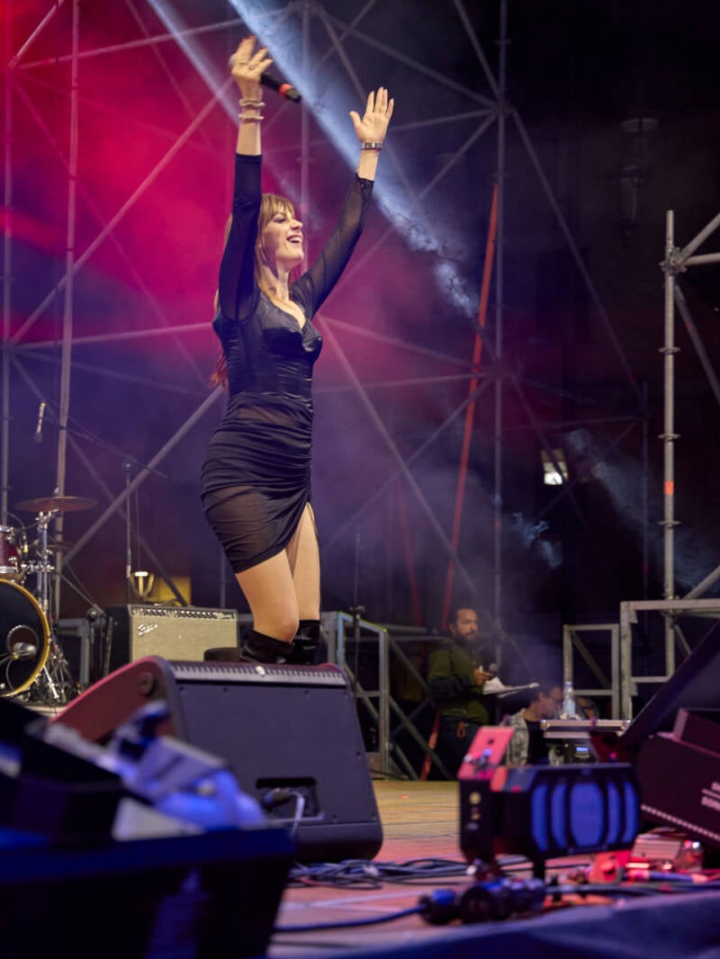 Un outfit più pratico – pantaloni, top stabile, scarpe sicure – permette di scendere dal palco, saltare, avvicinarsi, toccare mani.